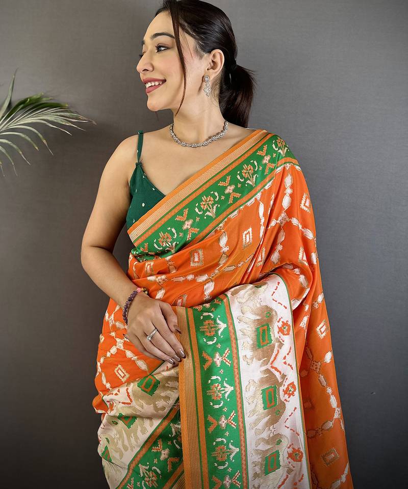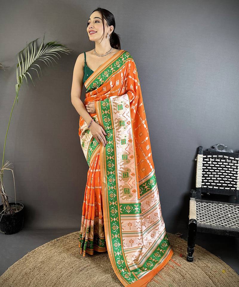 Orange banarasi silk blend orange motifs inspired by nature saree with unstitched blouse