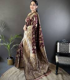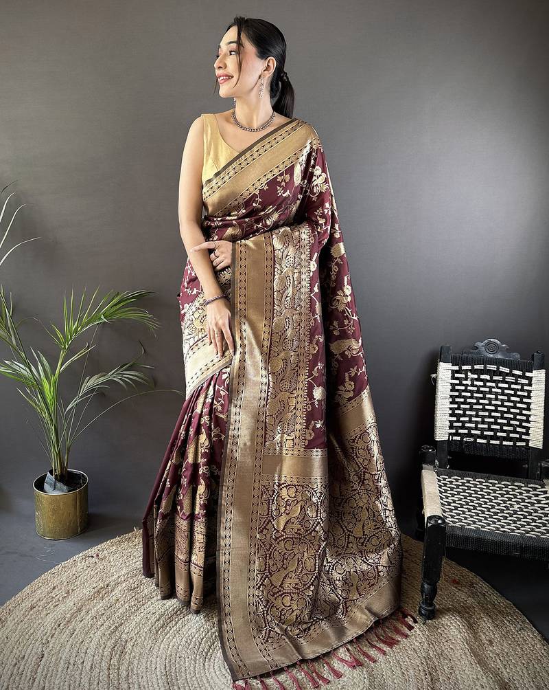 Brown banarasi soft lichi silk blend brown floral and zari pattern saree with unstitched blouse