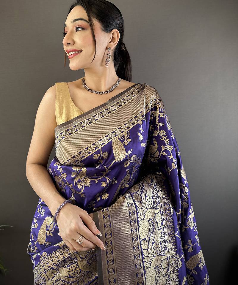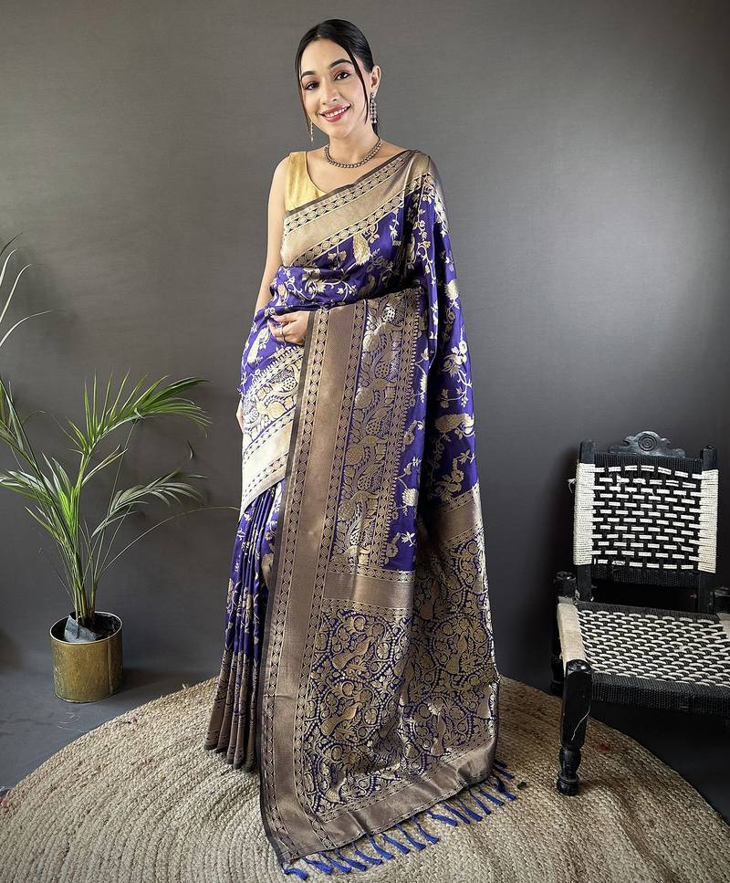 | Product Name | Blue Banarasi Soft Lichi Silk Blend Royal Blue Floral And Zari Pattern Saree With Unstitched Blouse | |