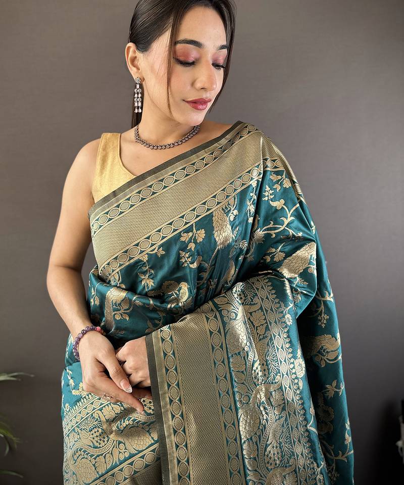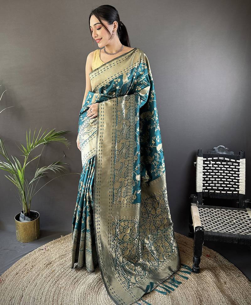 | Product Name | Blue Banarasi Soft Lichi Silk Blend Teal Blue Floral And Zari Pattern Saree With Unstitched Blouse | |