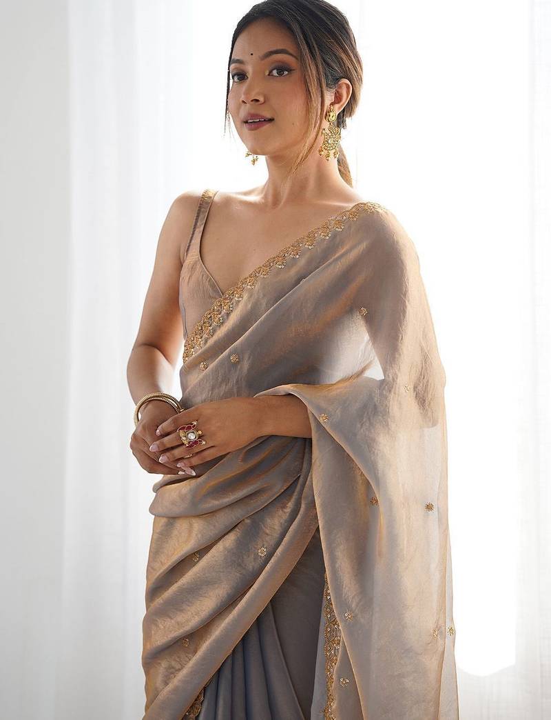 | • | Saree | : | Color- Chiku / Fabric- Silk Blend |