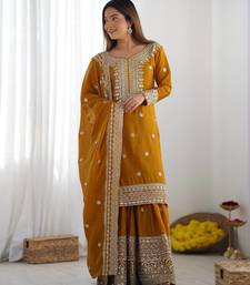 Women musturd sequins , zari, coding & thread embroidered work silk kurta set
