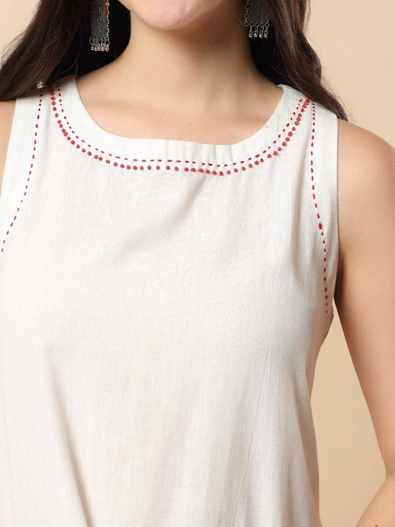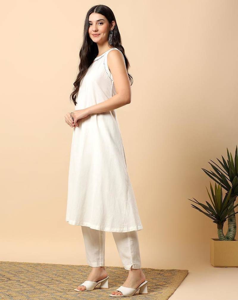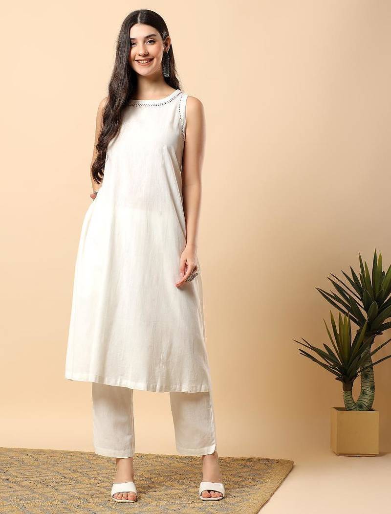 Women off white cotton flex solid & hand embroidery work kurta with trousers set