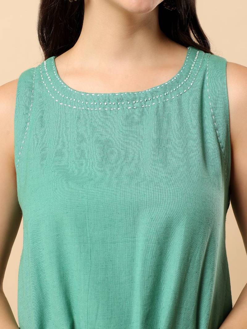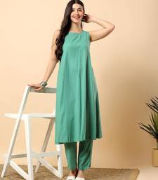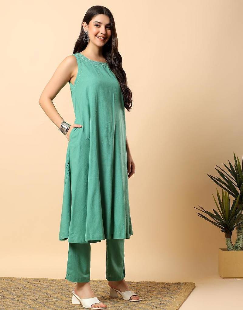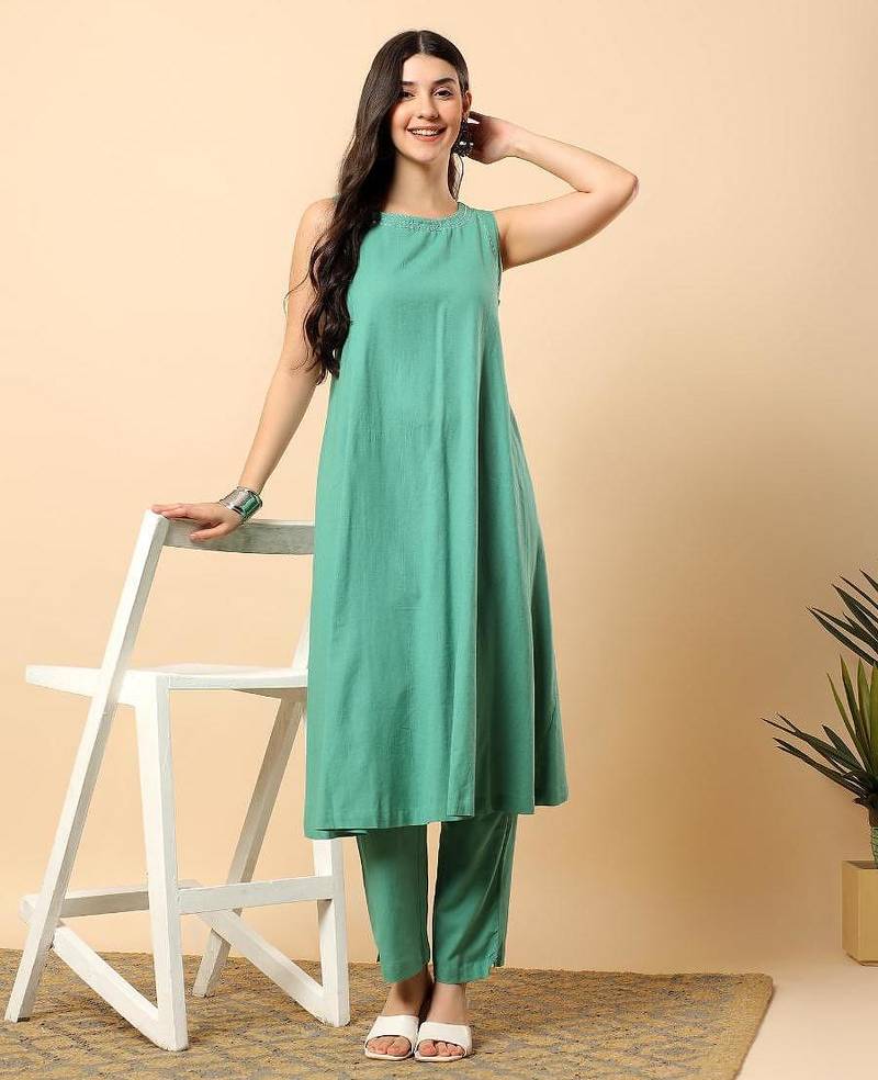 Women sea green cotton flex solid & hand embroidery work kurta with trousers set