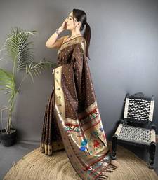 Soft lichi art silk brown peacock & floral motifs kanchipuram saree