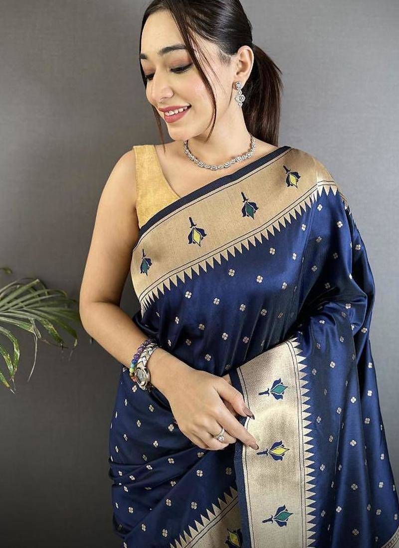 | Product Name | Soft Lichi Art Silk Dark Blue Peacock & Floral Motifs Kanchipuram Saree | |