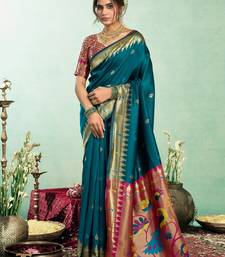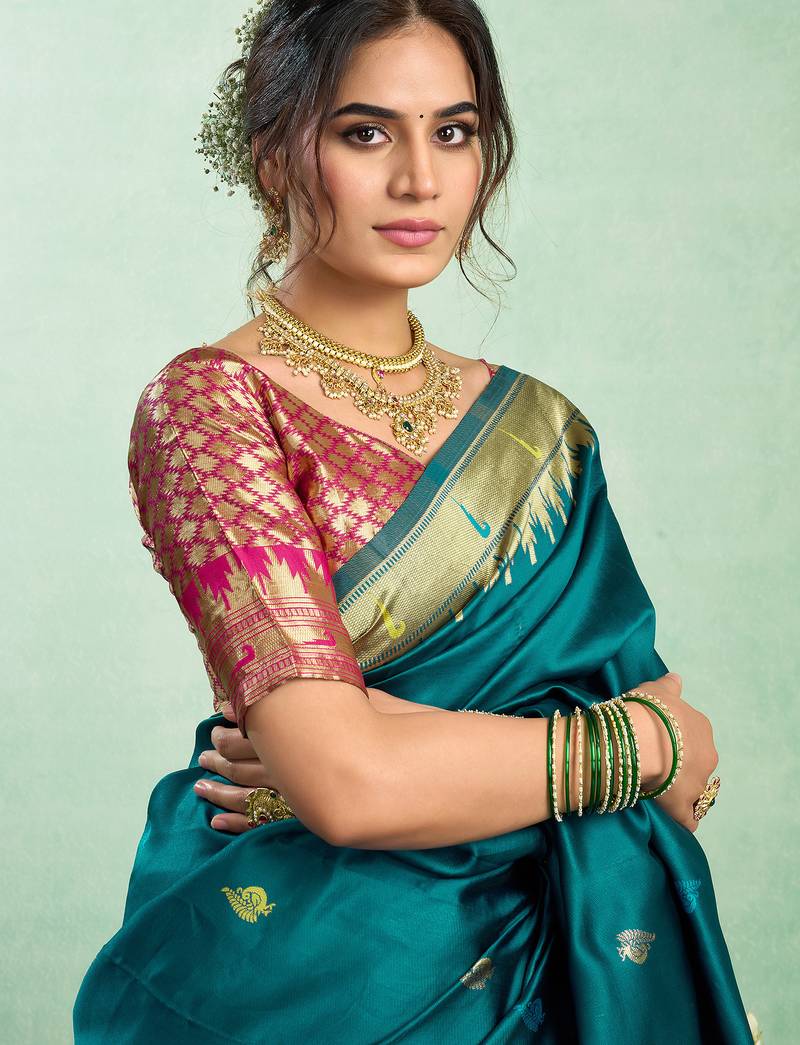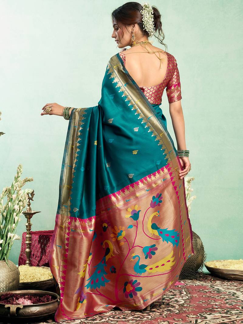 | Product Name | Women Teal Blue Peacock Motifs Silk Blend Saree | |