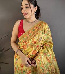 Women yellow floral & leaf elements pashmina silk saree