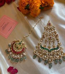 | Product Description | This Exquisite Luxurious Gold Plated Emerald And Kundan Jadau Passa With Maang Tikka Is A Stunning Piece Of Jewelry That Will Elevate Any Bridal Or Festive Look. It Features A Beautiful Combination Of Emeralds, Pink And White Kundan, And Mint Green Beads And Pearls, Creating A Look Of Timeless Elegance. The Intricate Jadau Work And Delicate Design Make This Set A True Masterpiece. The Medium Size Passa And Maang Tikka Can Be Worn Together For A Complete Bridal Look, Or Separately For A More Versatile Style. Base Material : Alloy Includes: One Passa