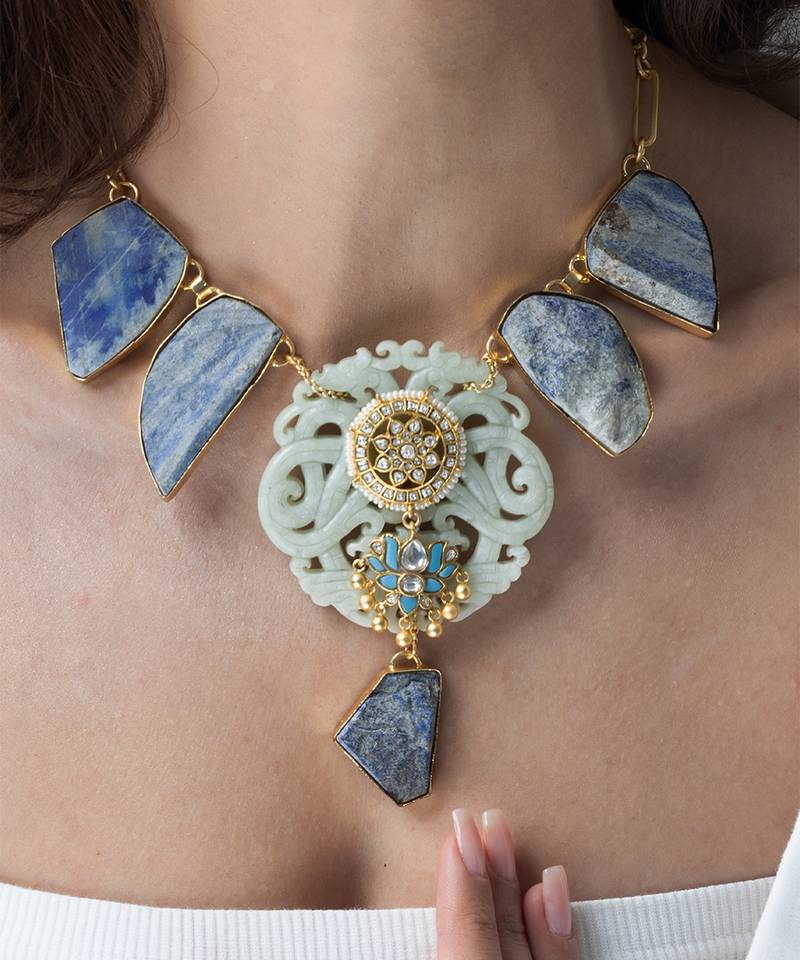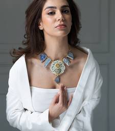 | Product Description | This Necklace Is An Extraordinary Piece That Has An Intricate Artistry With Raw, Natural Stone Elements. This Smooth, Ivory Toned Carving Is Crowned With Rich Gold Detailing And Subtle Accents Of Sky Blue Color, Giving The Piece Its Regal, Imperial Aura.