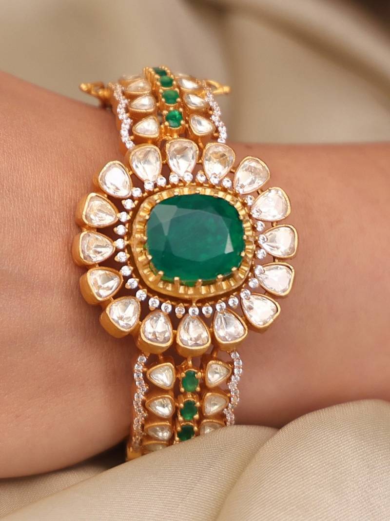 Product Description | The Emerald Crown Bracelet Blends Golden Work With A Striking Green Centerpiece, Surrounded By Sparkling Stones. Elegant And Bold, It Makes It Perfect Bracelet For Celebrations, Enhancing Your Sophisticated Charm.