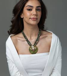 | Product Description | This Elegant Long Necklace Features A Double Strand Design In Soothing Green And Earthy Tones, Highlighted By A Beautifully Detailed Circular Pendant With Subtle Pink And White Accents.