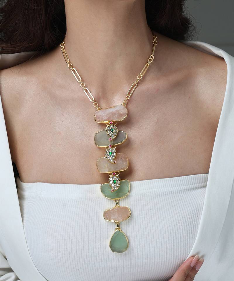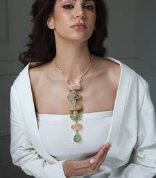 | Product Description | This Opulent Shopjbr Long Necklace Features A Dense Cluster Of Rose Quartz And Emerald Hued Stones Set In Style Frames. The Lavish Design Is Completed With Tiny Pearl Drops, Creating A Stunning Centrepiece For Your Wedding Attire.