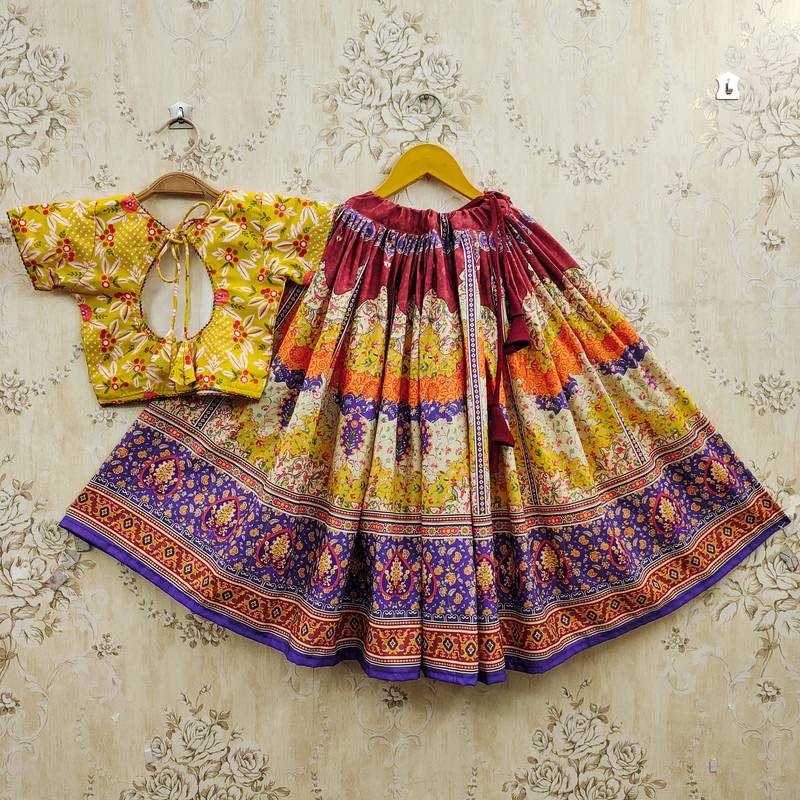 Yellow viscose rayon printed kids lehenga choli