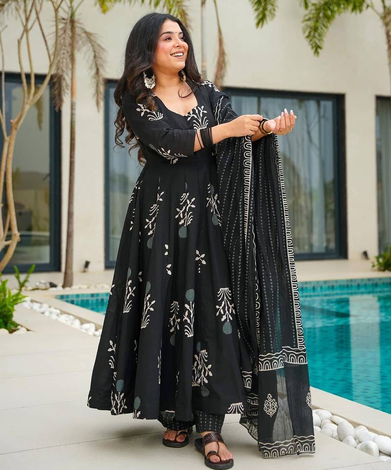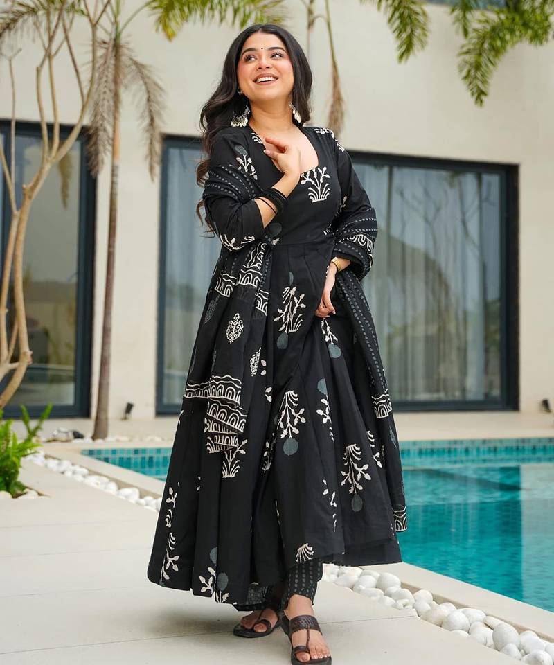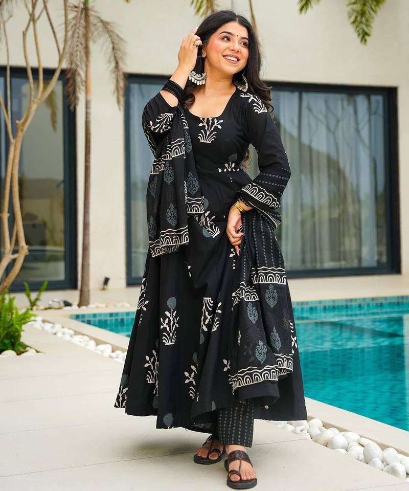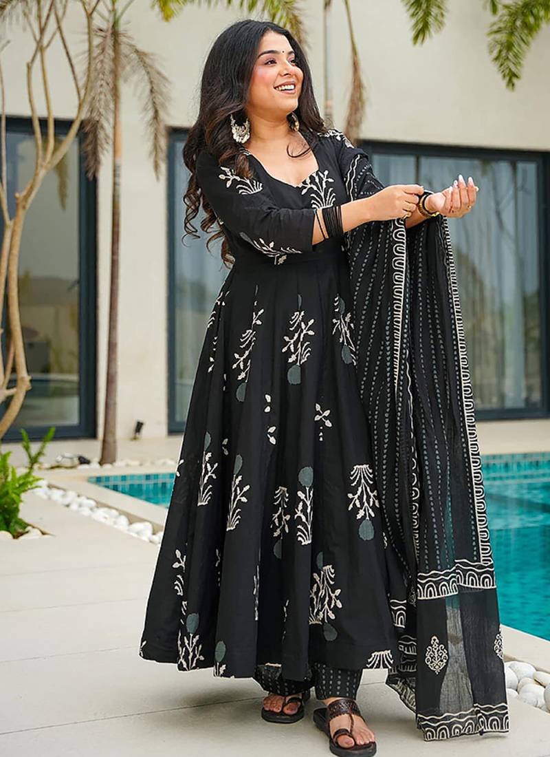 Black digital printed mal cotton anarkali set with dupatta stitched