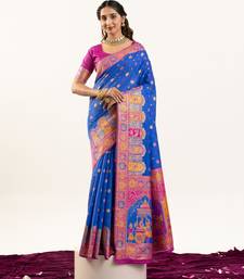 Blue banarasi pashmina soft silk zari woven saree with blouse
