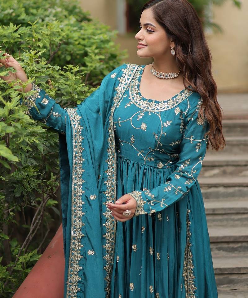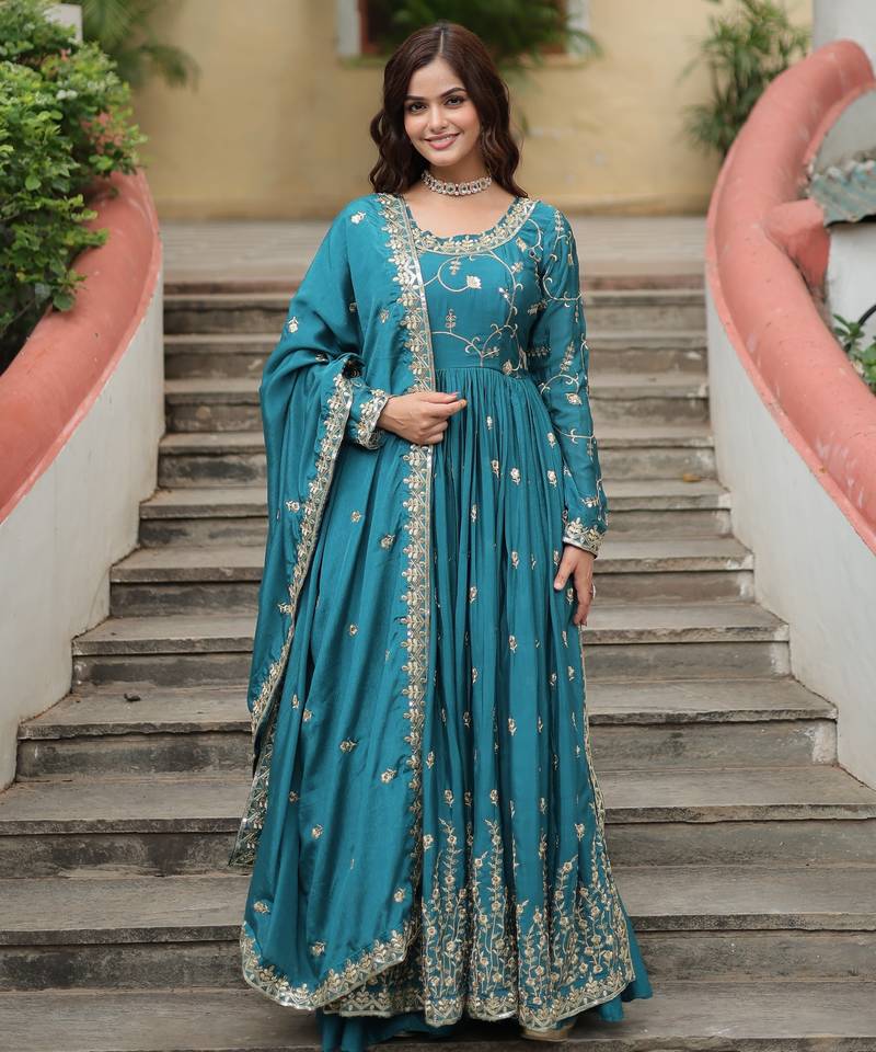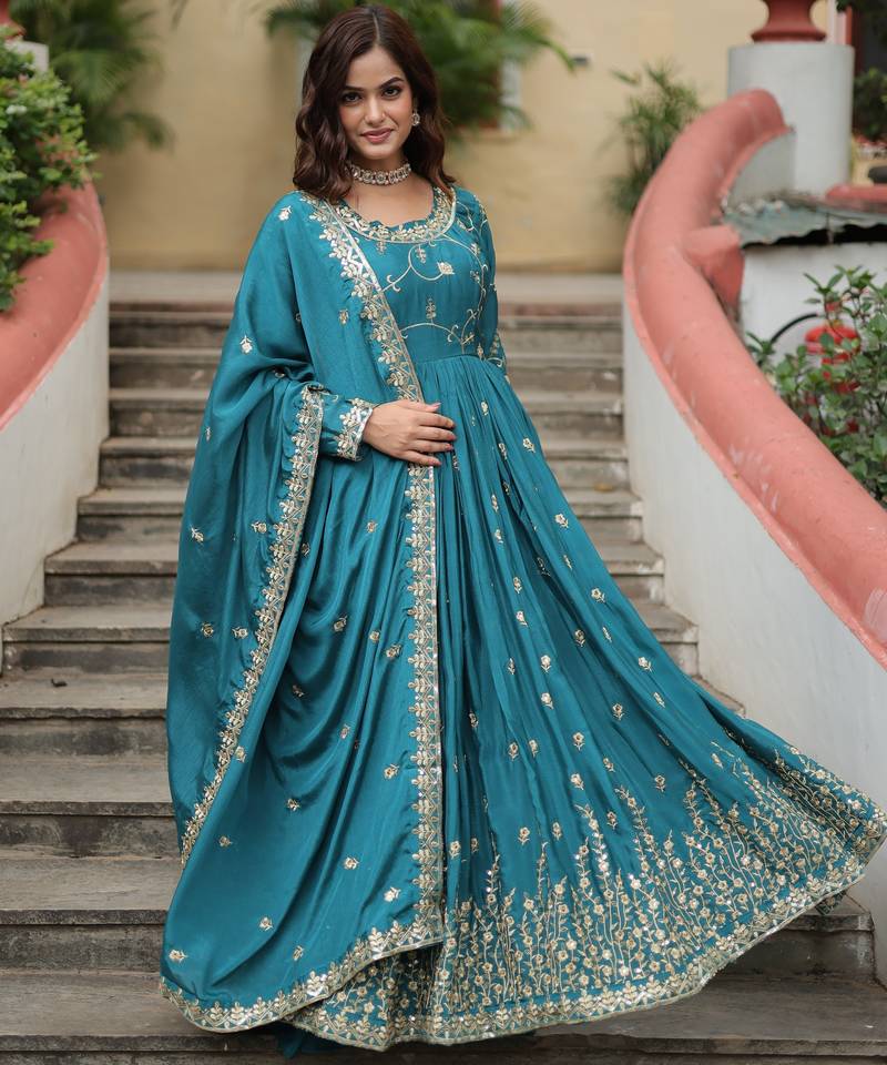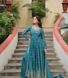 | Product Name | Blue Chinon Embroidered Designer Anarkali Sharara Set | |