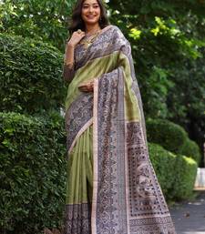 Green soft tussar silk madhubani printed saree with blouse