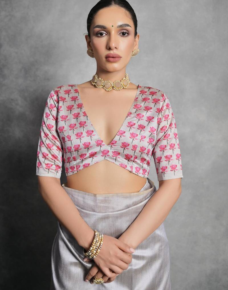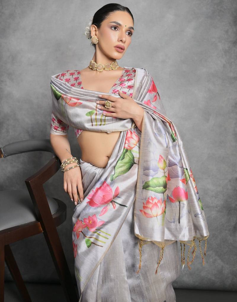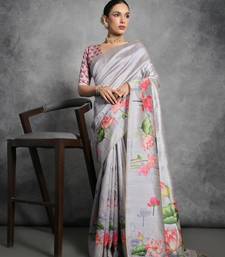 Grey soft tussar silk floral printed saree with blouse