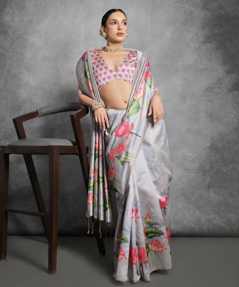 | Product Name | Grey Soft Tussar Silk Floral Printed Saree With Blouse | |
