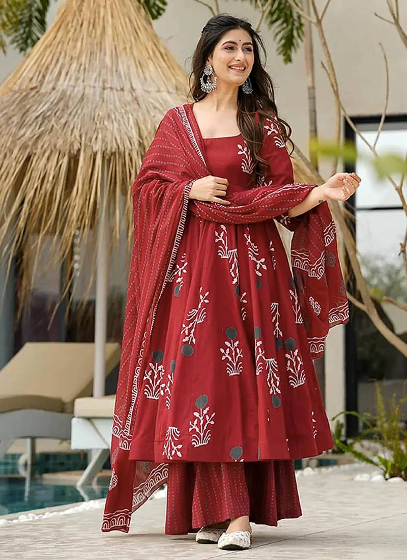 Maroon digital printed mal cotton anarkali set with dupatta stitched