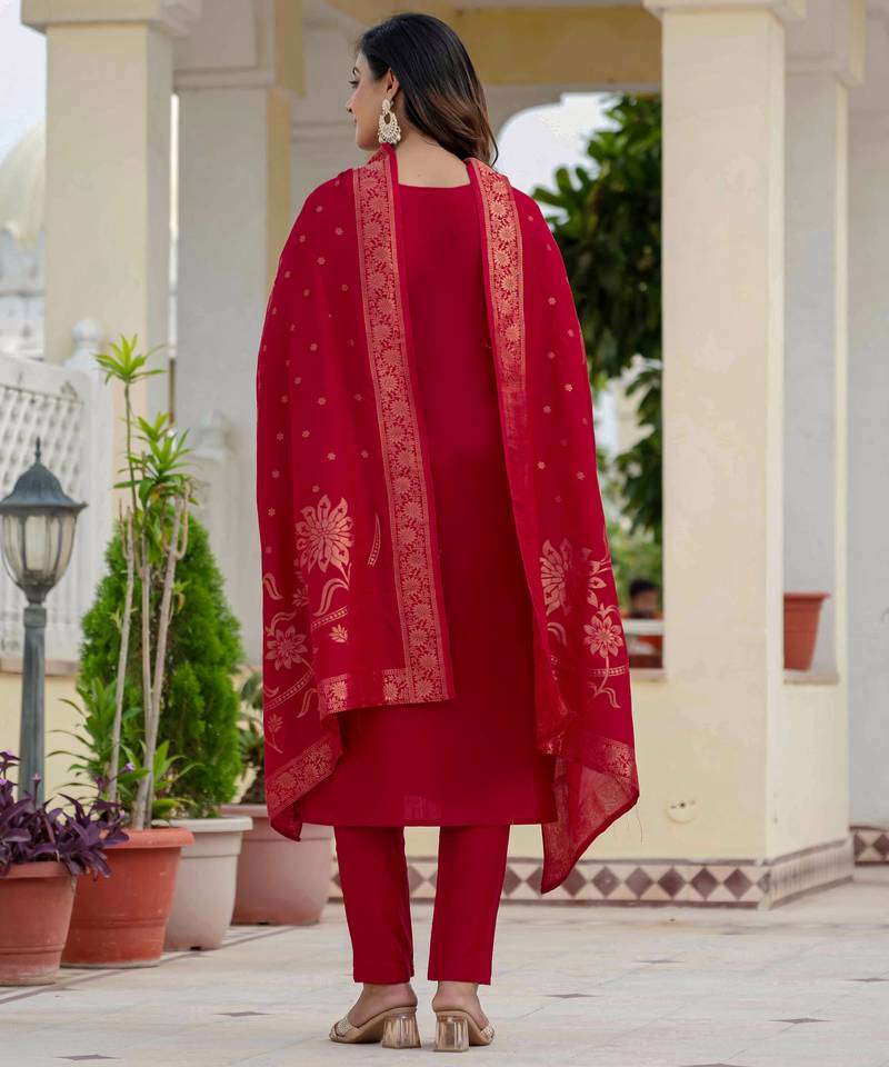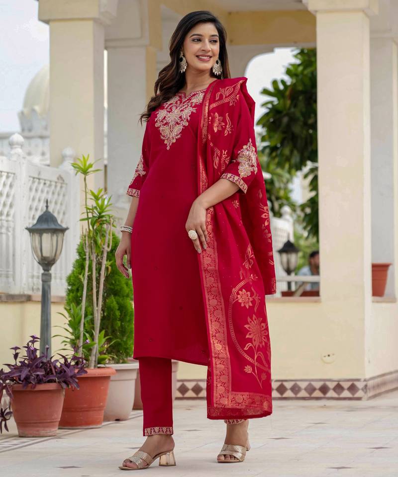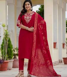 Maroon embroidered roman silk kurta set with dupatta stitched