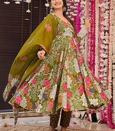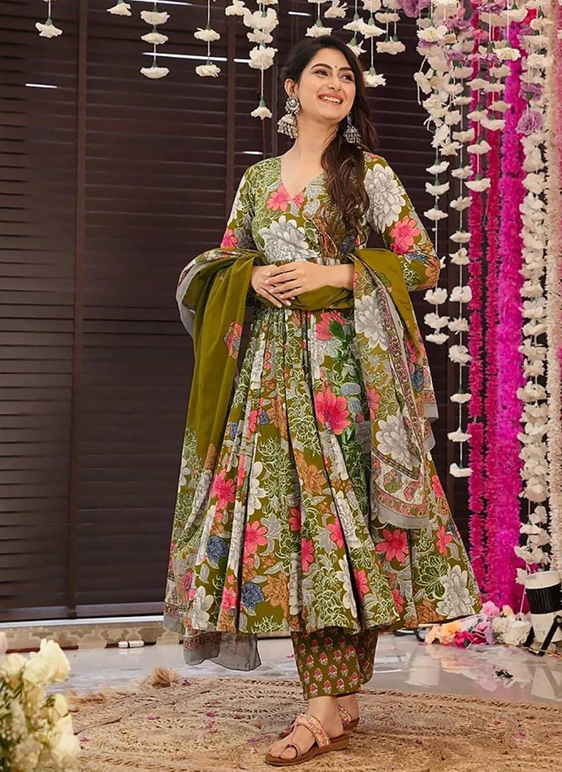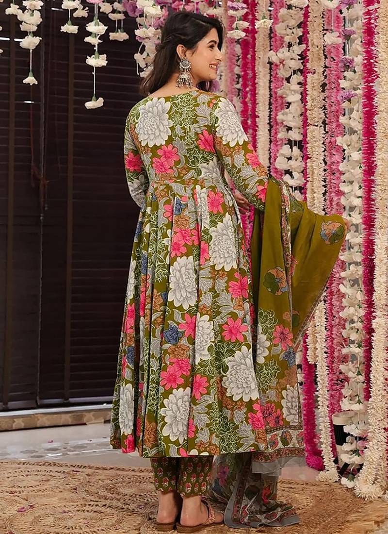Mehendi digital printed muslin cotton stitched anarkali set with dupatta