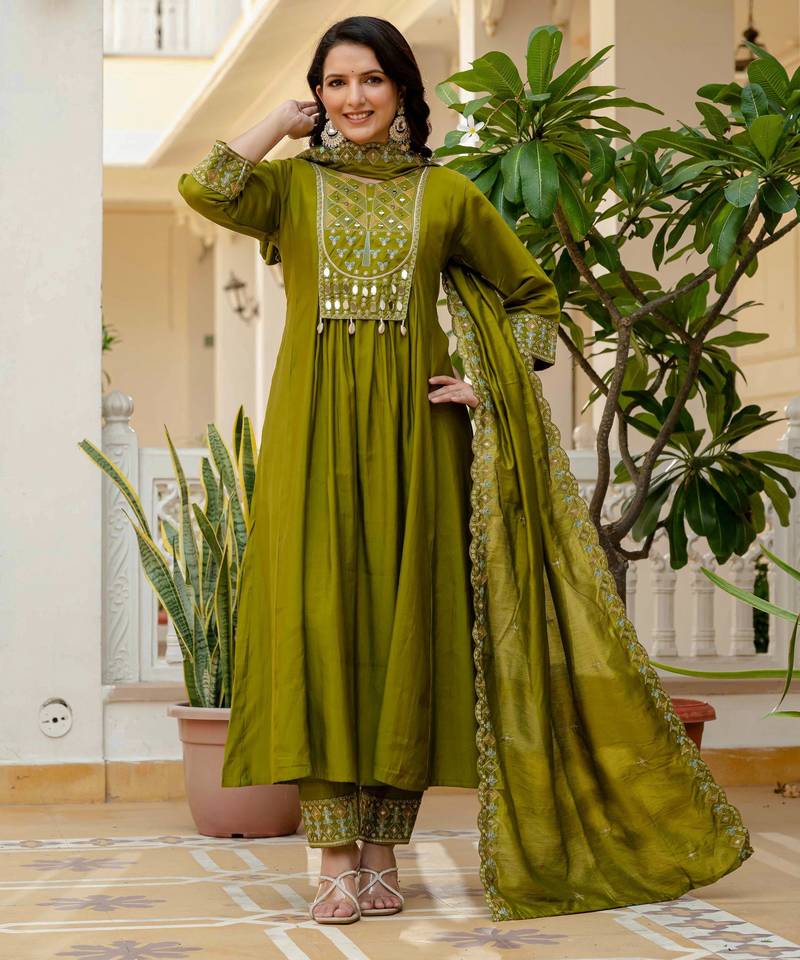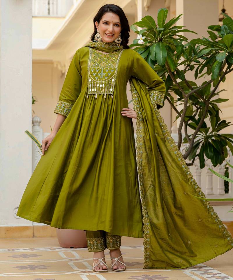 Mehendi embroidered viscose roman silk kurta set with dupatta stitched