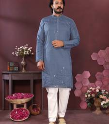 Men's blue silk mirror embroidered kurta with pajama set