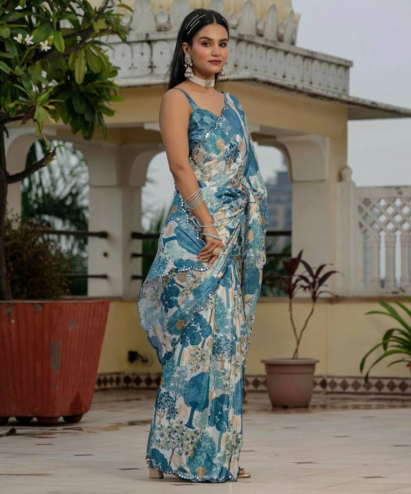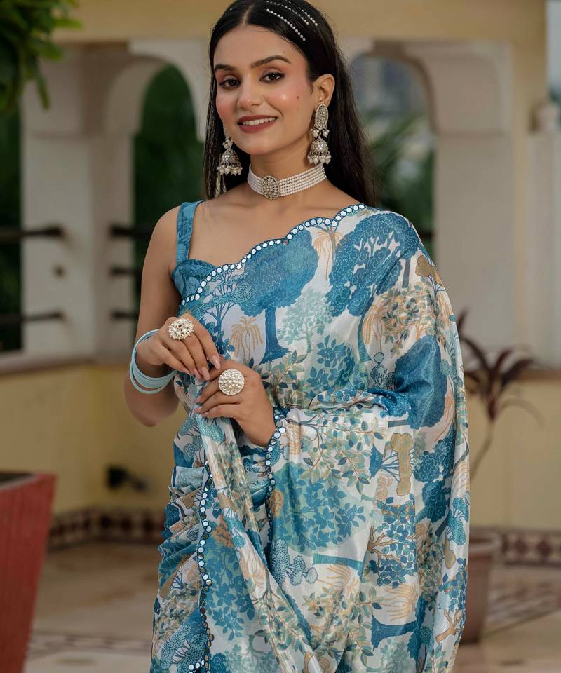 Morpich chinon digital print with mirror saree with blouse
