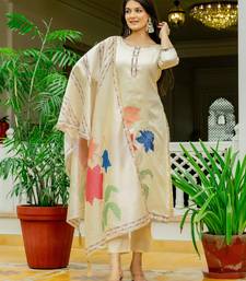 Off white embroidered viscose assam silk kurta set with dupatta stitched