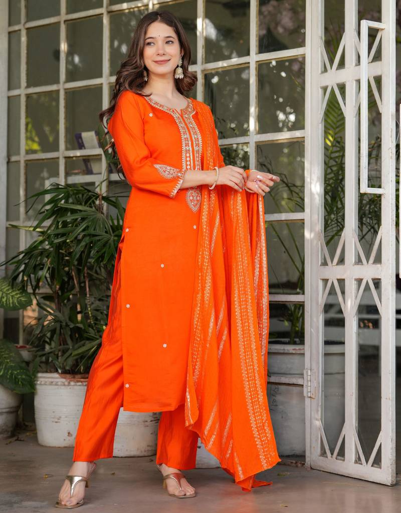 Orange embroidered viscose chanderi kurta set with dupatta stitched