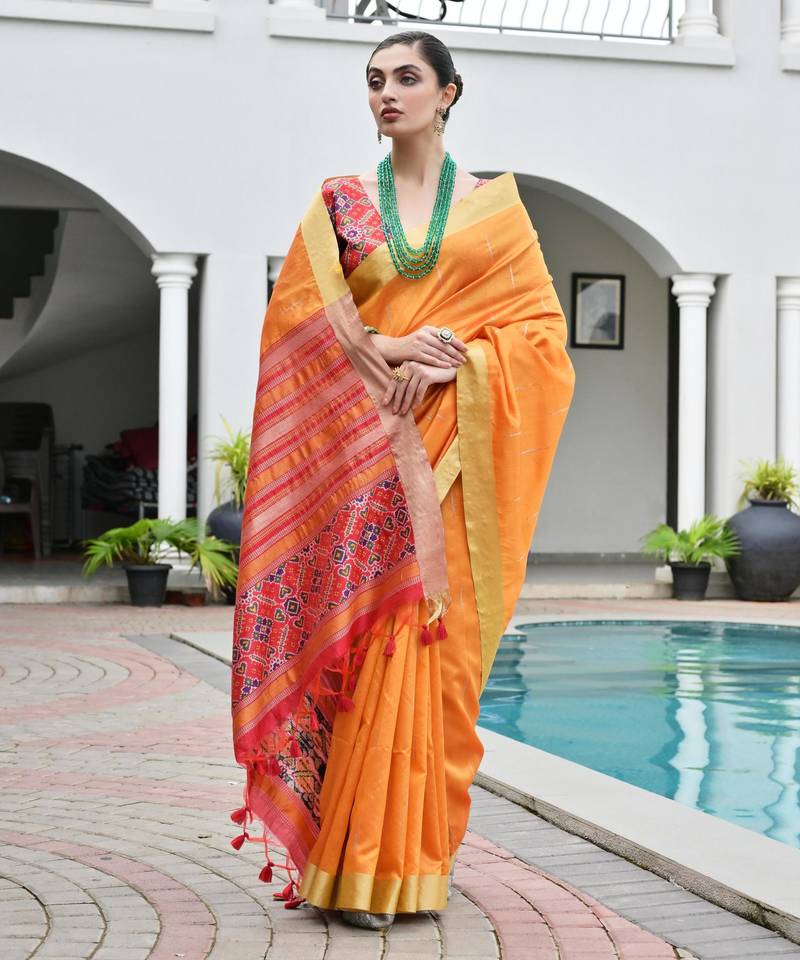 | Product Name | Orange Khadi Raw Silk Meena Weaving Patola Saree With Blouse | |