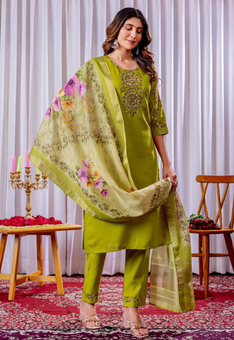 | Product Name | Parrot Green Embroidered Viscose Silk Kurta Set With Dupatta | |
