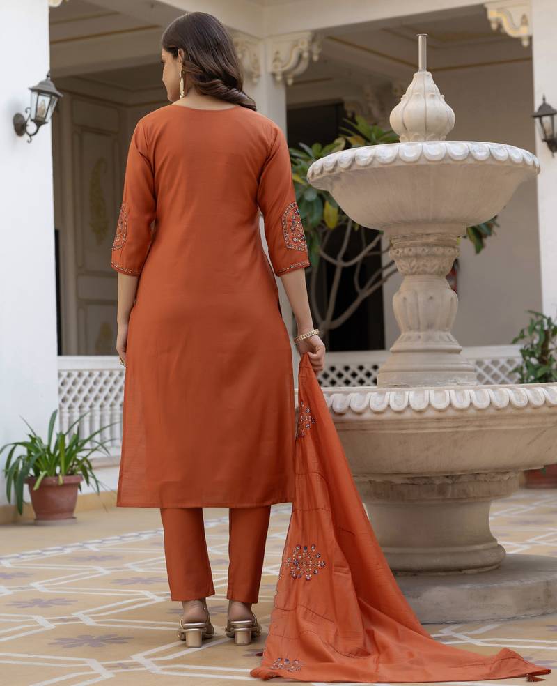 | Product Name | Rust Embroidered Viscose Mango Silk Kurta Set With Dupatta | |