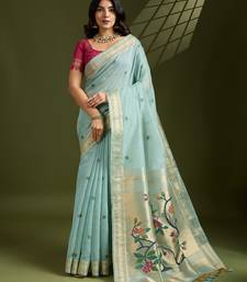 Sky blue soft muga cotton paithani zari woven saree with blouse