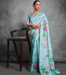 Sky blue soft tussar silk floral printed saree with blouse
