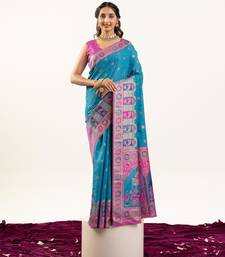 Turquoise banarasi pashmina soft silk zari woven saree with blouse