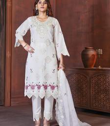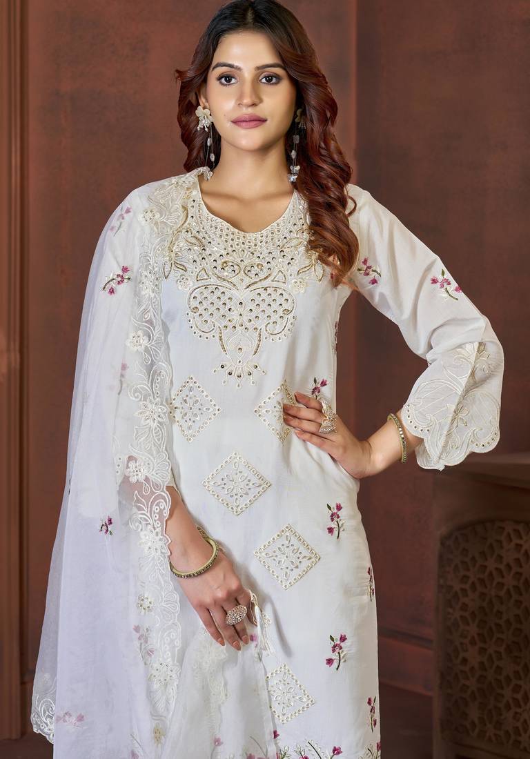 White embroidered viscose roman kurta set with dupatta stitched