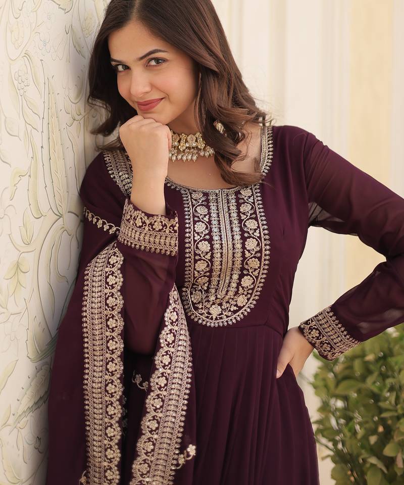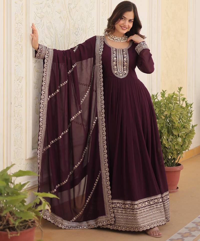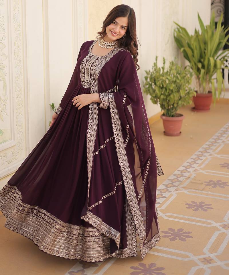 | Product Name | Wine Faux Blooming Sequins Embroidered Anarkali Gown With Dupatta | |