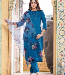Women's blue silk handwork designer kurta set with dupatta stitched