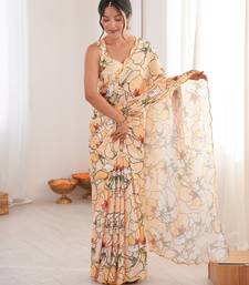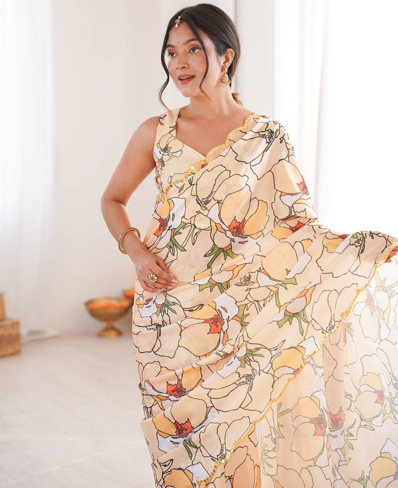 Women s cream digital printed chinon saree with blouse