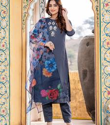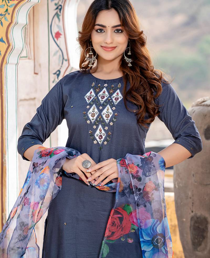 Women's dark grey silk handwork designer kurta set with dupatta stitched