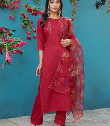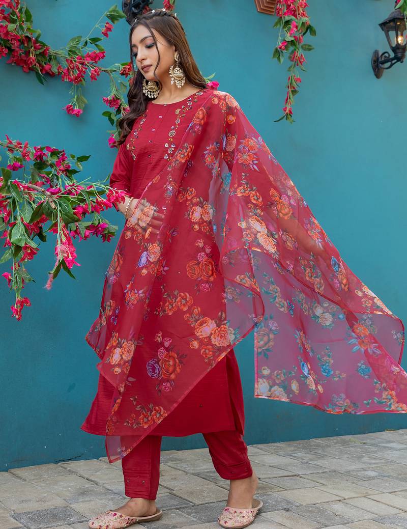 Women's maroon silk handwork designer kurta set with dupatta stitched