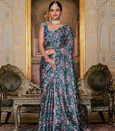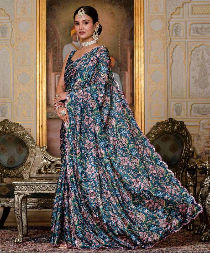 navy blue chinon digital print with mirror saree with blouse