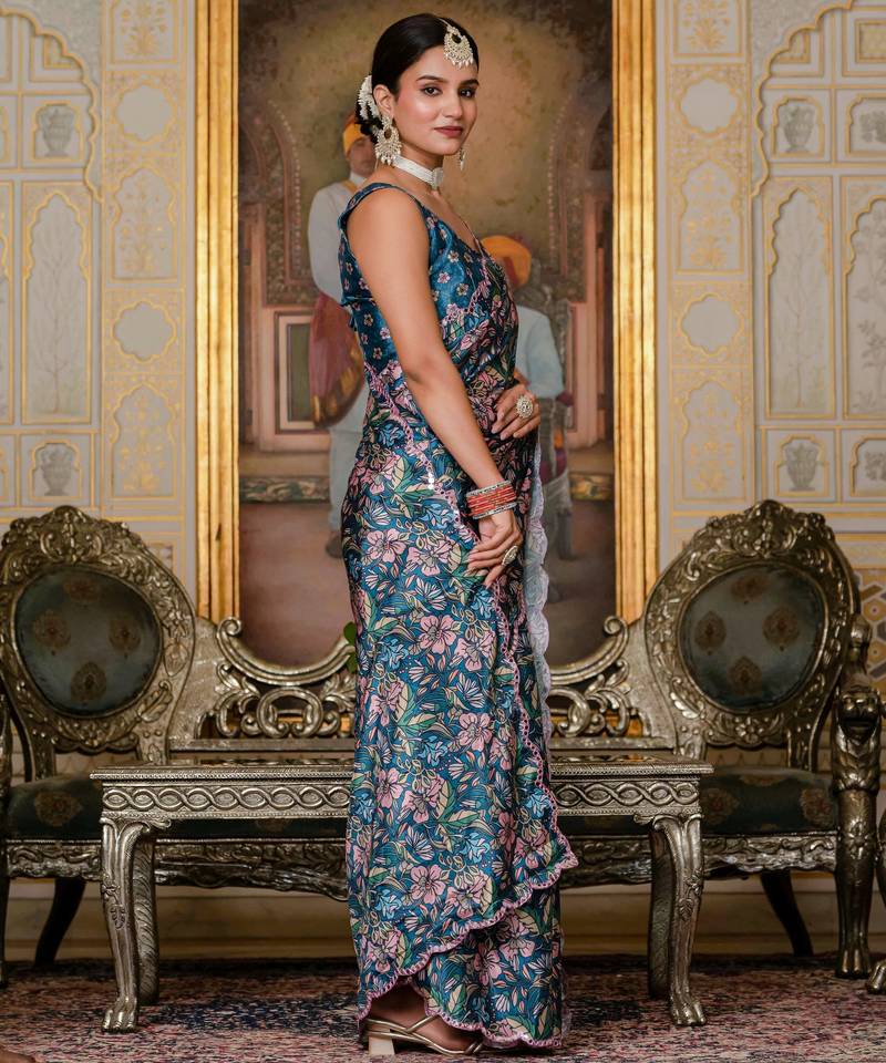 blue chinon digital print with mirror saree with blouse