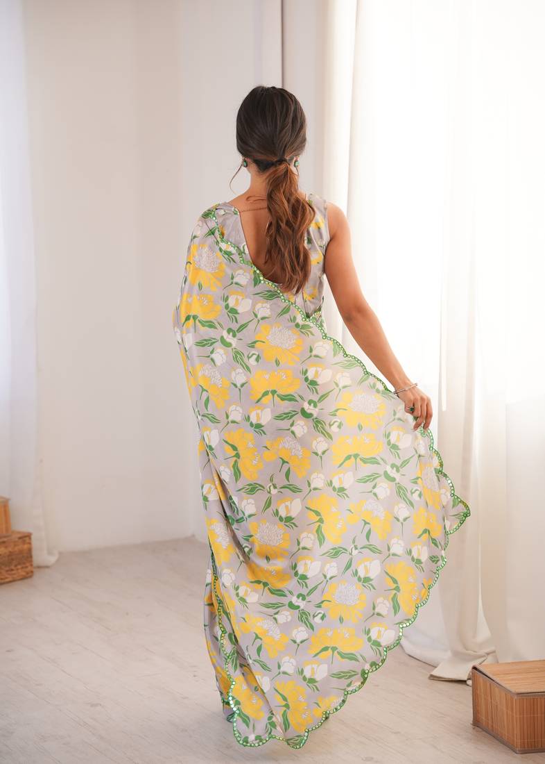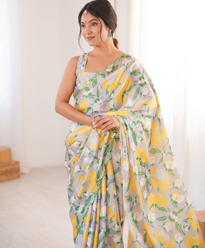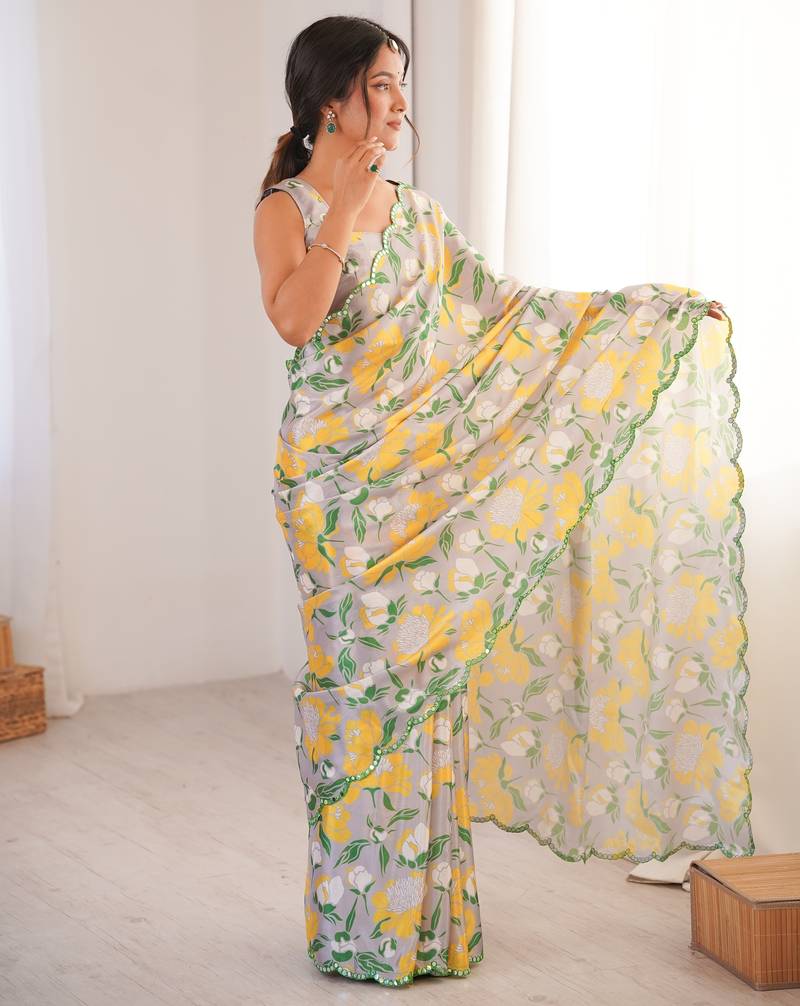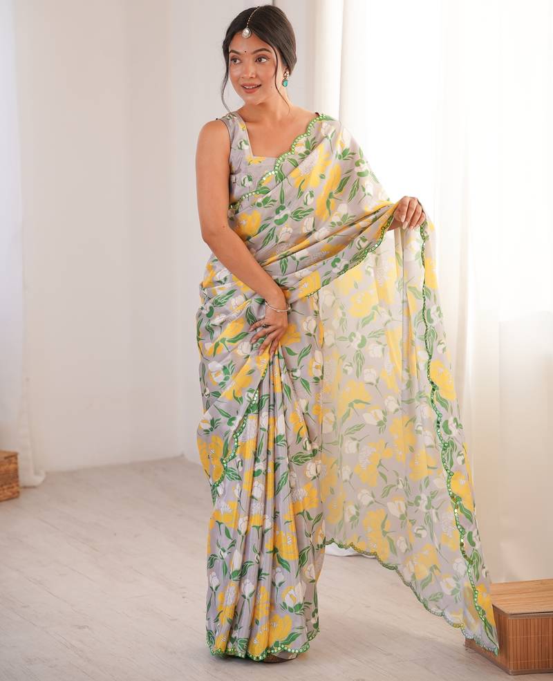 | Product Description | The Multicolor Chinon Saree Features A Soft Digital Floral Print Arranged Evenly Across The Fabric. Yellow And Green Floral Motifs Stand Out Clearly Against The Subtle Base Tone, Creating A Balanced And Fresh Appearance. The Chinon Fabric Has A Lightweight And Flowing Texture That Allows The Saree To Drape Smoothly And Form Neat Pleats. The Printed Border Along The Edges Gives A Defined Finish Without Making The Design Look Heavy. This Saree Comes With A Matching Blouse Piece That Follows The Same Digital Printed Theme. The Blouse Fabric Can Be Stitched According To Preferred Fit And Style. The Smooth Chinon Material Keeps The Saree Comfortable For Long Hours And Easy To Carry. The Combination Of Light Fabric And Clear Floral Patterns Makes This Saree Suitable For Women Who Prefer Soft Materials With Noticeable Yet Steady Designs. |