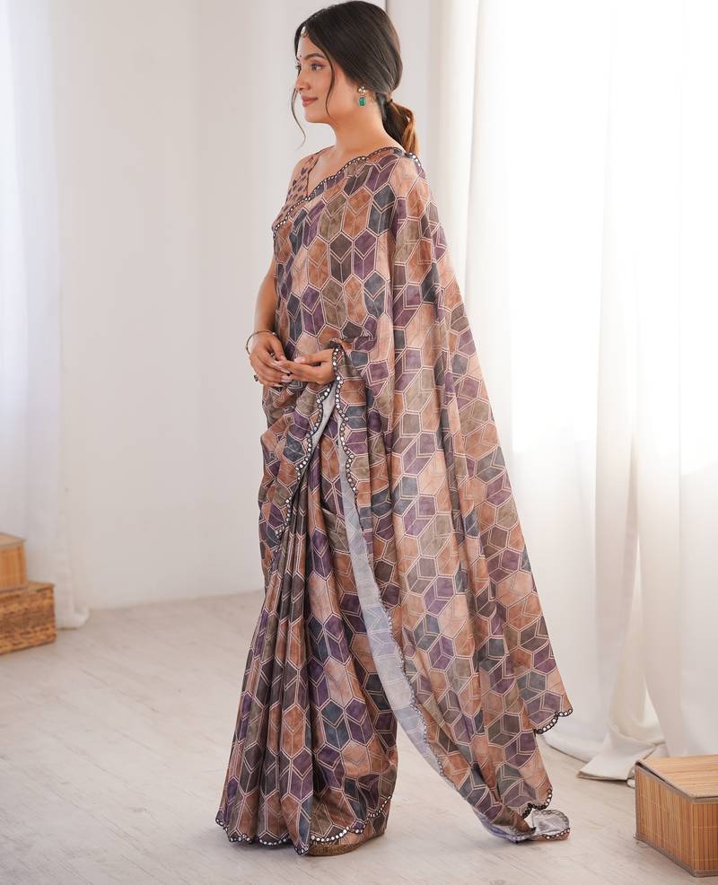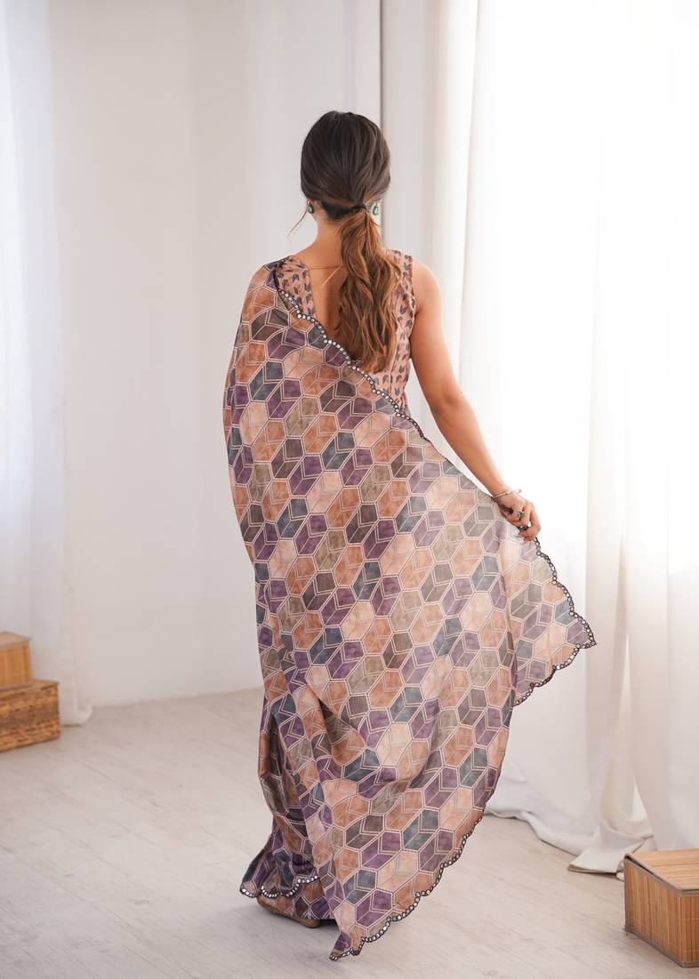 | Product Description | This Multicolor Chinon Saree Features A Detailed Digital Geometric Print Arranged In A Structured Pattern Across The Fabric. Shades Of Brown, Mauve, And Muted Purple Combine Smoothly To Create A Balanced Design. The Chinon Fabric Feels Soft And Lightweight, Allowing The Saree To Fall Neatly And Form Clean Pleats. A Subtle Printed Border Along The Edges Gives The Saree A Defined Finish Without Making It Heavy. The Saree Comes With A Matching Blouse Piece Designed To Complement The Overall Digital Print Theme. The Blouse Fabric Can Be Stitched According To Personal Fit And Preference. The Smooth Texture Of Chinon Makes The Saree Easy To Drape And Comfortable To Wear For Extended Hours. The Combination Of Structured Geometric Design And Soft Fabric Makes This Saree Suitable For Women Who Prefer Clear Patterns With A Steady Color Mix. |