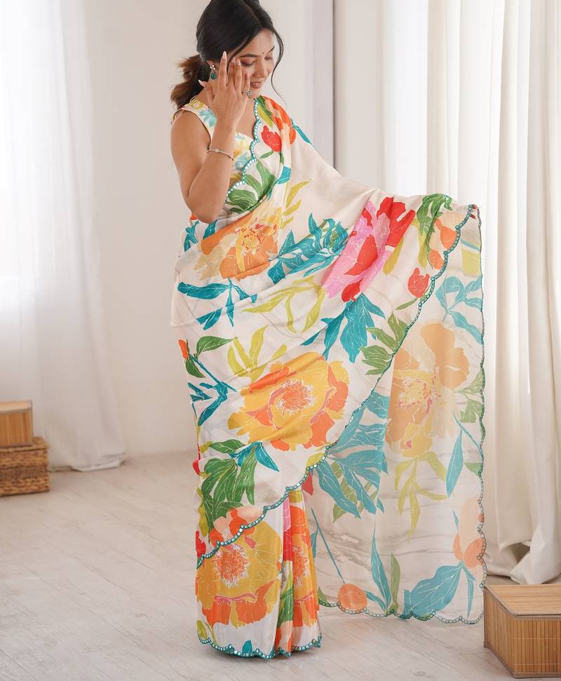 | Product Description | This Multicolor Chinon Saree Features Bold Floral And Leaf Digital Prints In Shades Of Orange, Green, Yellow, And Soft Pink Over A Light Base. The Large Print Placement Creates A Bright And Eye Catching Look, While The Detailed Scalloped Border Adds A Neat Finishing Touch Along The Edges. The Matching Blouse Piece Follows The Same Print Theme, Giving The Saree A Coordinated Appearance. Crafted From Lightweight Chinon Fabric, The Saree Feels Smooth And Flows Beautifully When Draped. The Material Allows Easy Pleating And Maintains A Soft Fall Throughout. The Combination Of Vibrant Colors And Breathable Fabric Makes It A Comfortable Yet Stylish Choice For A Refined Traditional Look. |