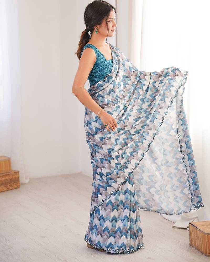| Product Description | The Multicolor Chinon Saree Features A Soft Digital Print Arranged In A Repeating Wave Inspired Pattern Across The Fabric. Shades Of Blue, Grey, And Muted Tones Blend Smoothly, Creating A Balanced And Steady Look. The Chinon Material Has A Lightweight And Flowing Texture That Allows The Saree To Drape Naturally And Form Neat Pleats. The Printed Border Along The Edges Gives The Saree A Clean Outline And Structured Finish. This Saree Comes With A Matching Blouse Piece That Follows The Same Digital Printed Theme. The Blouse Fabric Can Be Stitched According To Preferred Fit And Style. The Smooth Chinon Texture Keeps The Saree Comfortable For Long Hours And Easy To Manage. The Combination Of Fluid Fabric And Patterned Design Makes This Saree Suitable For Women Who Prefer Light Materials With Clear And Well Placed Prints. |